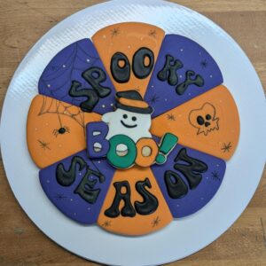The special Halloween cookie tart consists of 9 cookie pieces decorated with festive Halloween designs. Each piece is carefully adorned with royal icing, showcasing iconic Halloween elements such as spiders, ghosts, and skulls. The entire set is presented in an elegant white box with a window, perfect for gifting or adding a sweet touch to your Halloween celebrations.
